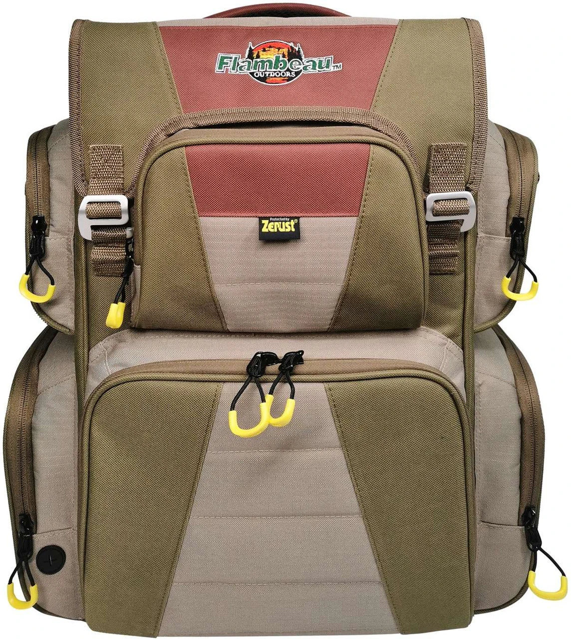 The Evolution Outdoor 5007 Flambeau Heritage Backpack holds up to six 5007 Flambeau Utility Boxes with Zerust Dividers. This backpack features an internal fold out saddle bag style zippered storage, an external zipper pocket, side pocket line spool feed, padded carry straps, and a double G-Hook closure.